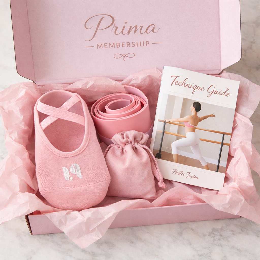 Includes Ballet Fusion Ballet & Barre Grip Socks, Ballet Fusion resistance band, 2026 printed technique guide and a personal welcome note from founder, Rhea.